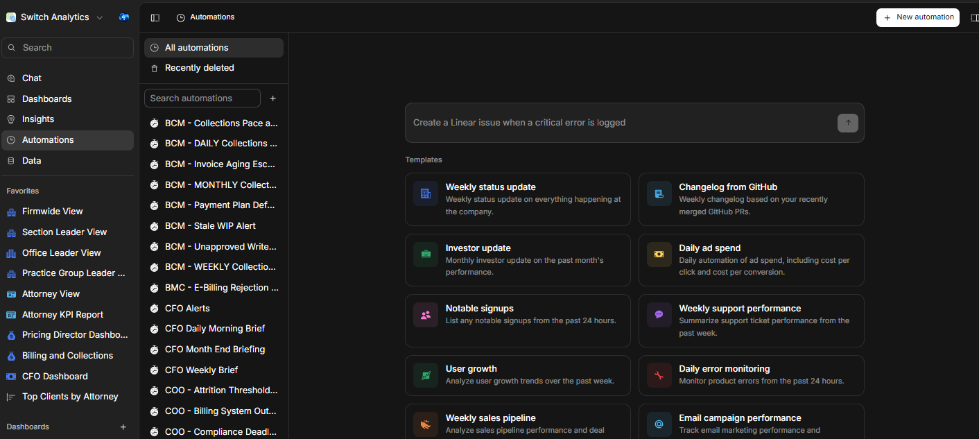 Configure automations through the same natural language interface you use for queries. No cron jobs, no ETL scripts, no developer involvement. Describe what you want monitored and how you want to be notified.